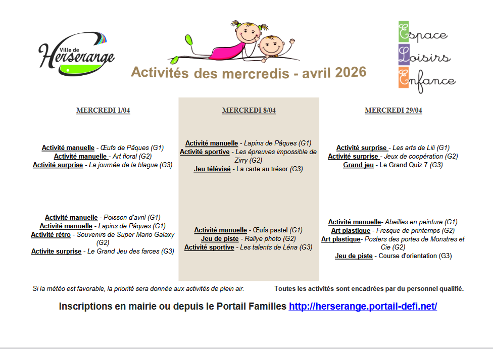 Activités des mercredis récréatifs - avril 2026